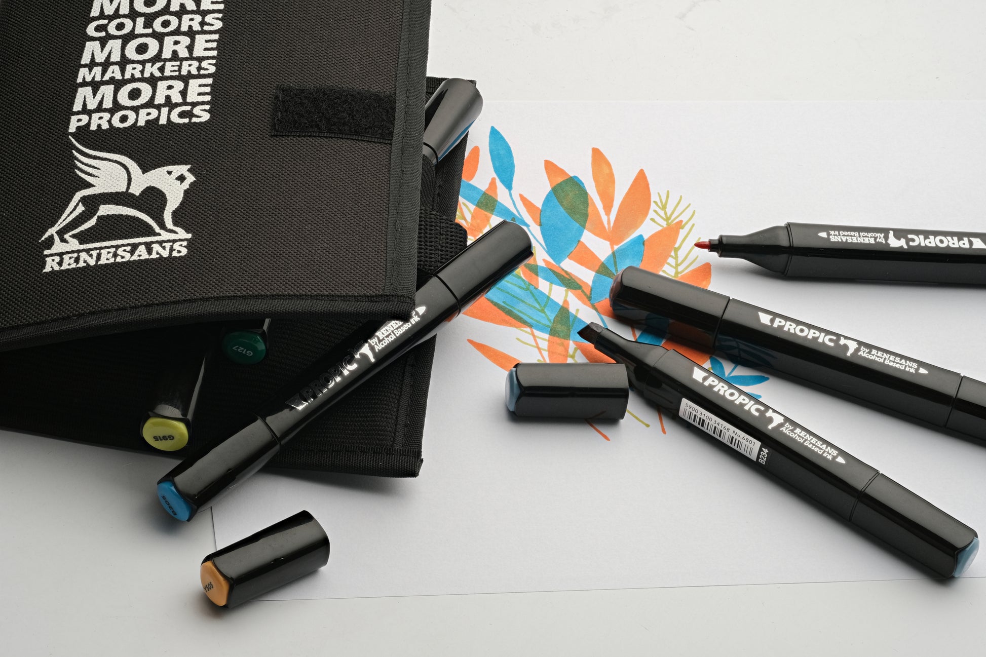 Propic markers are not only hydrophobic but are also resistant to smudging. Tones can be very easily modulated, forming smooth transitions with the use of a colourless blender. Each Propic marker has two tips: one thick and truncated for backgrounds or larger areas, and the other thin and conical for more precise work.