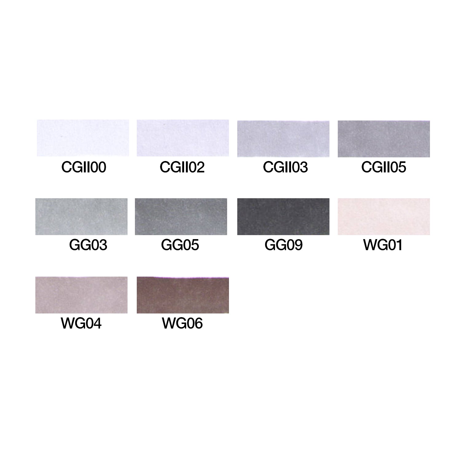 This set includes a material case and 10 Propic markers in colours: GG09, WG01, GG05, CGII05, WG06, CGII00, WG04, CGII03, GG03, CGII02.