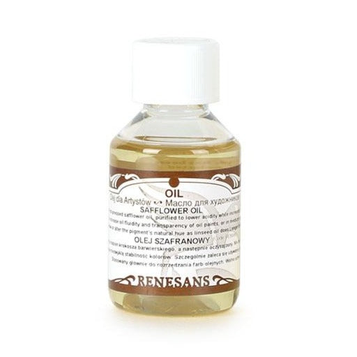 The RENESANS Safflower oil (Saffranolía) can be used to increase the fluidity and transparency of oil paints. It does not yellow or alters the pigment's natural hue as linseed oil does. It extends the drying time. Renesans safflower oil is first-pressed and purified to lower the acidity while increasing clarity.