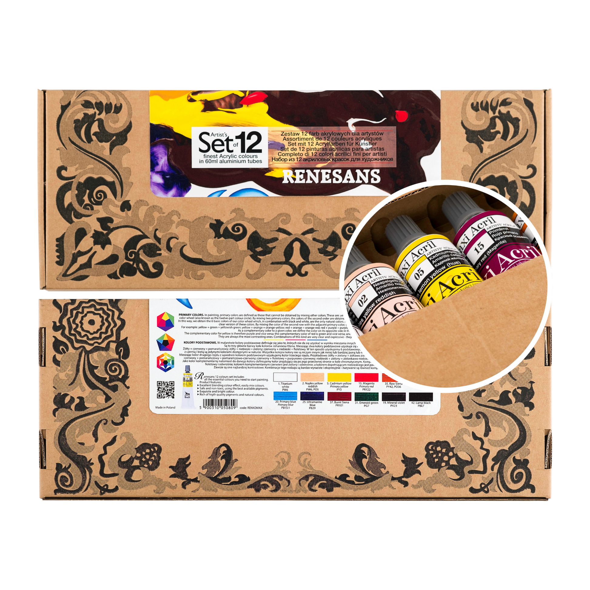 This acrylic painting set by Renesans contains 12 colours in 60 ml tubes and is packed in a beautiful and ecological carton box. The packaging is inspired by Polish folk art.