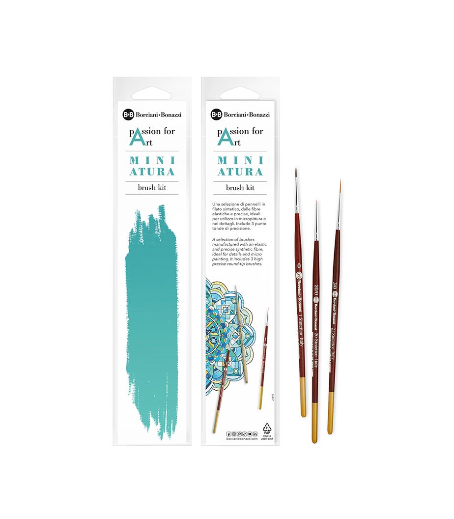 A selection of three brushes with elastic and precise synthetic fibres, ideal for micro painting, outlines and details.