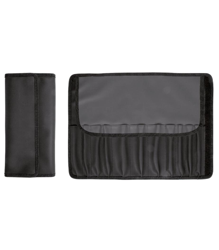 Black empty brush-holder with 12 pockets in PVC with protective flap velcro closure being resealable and reusable. Washable. Ideal for traveling, to contain brushes and other drawing material and for painting en plain air.