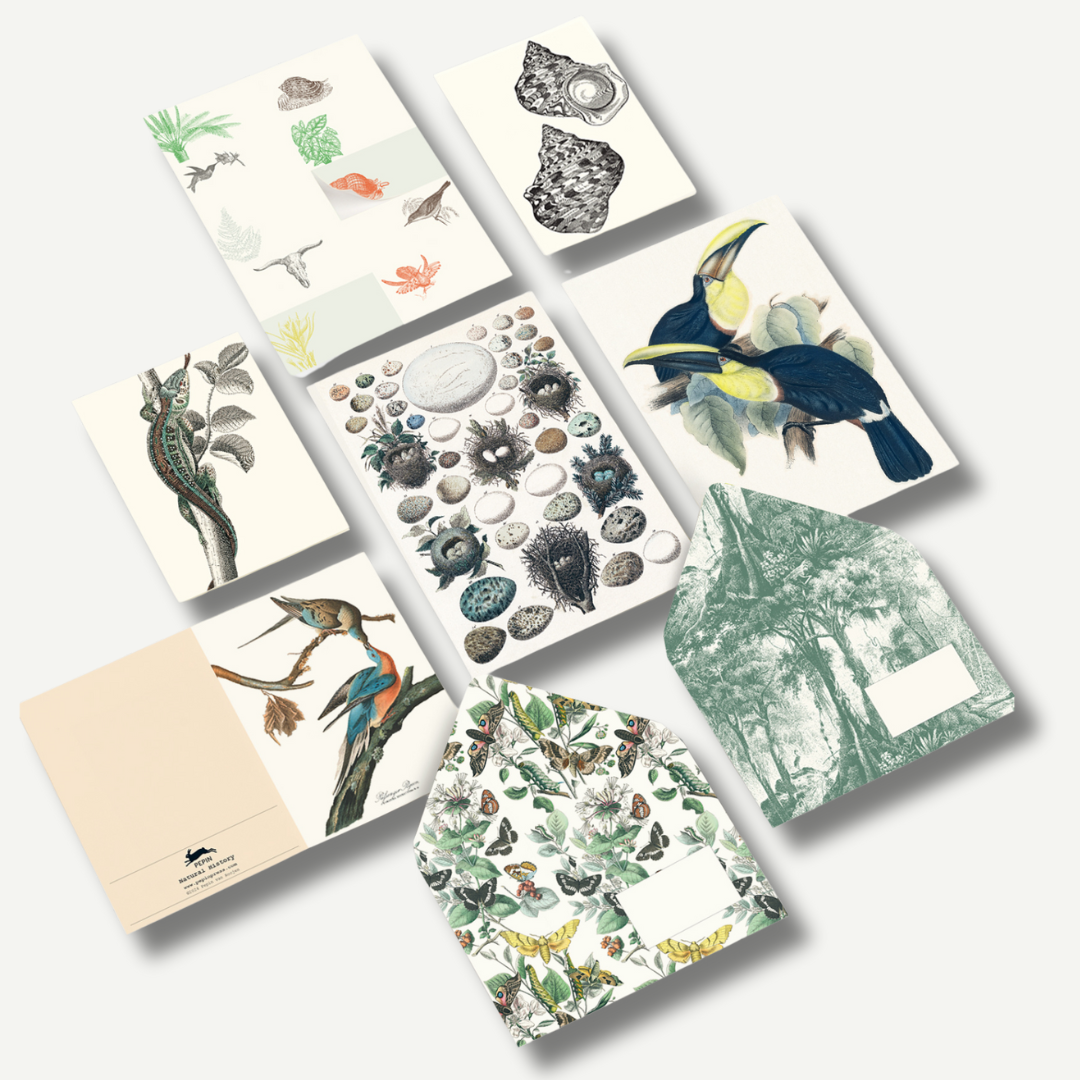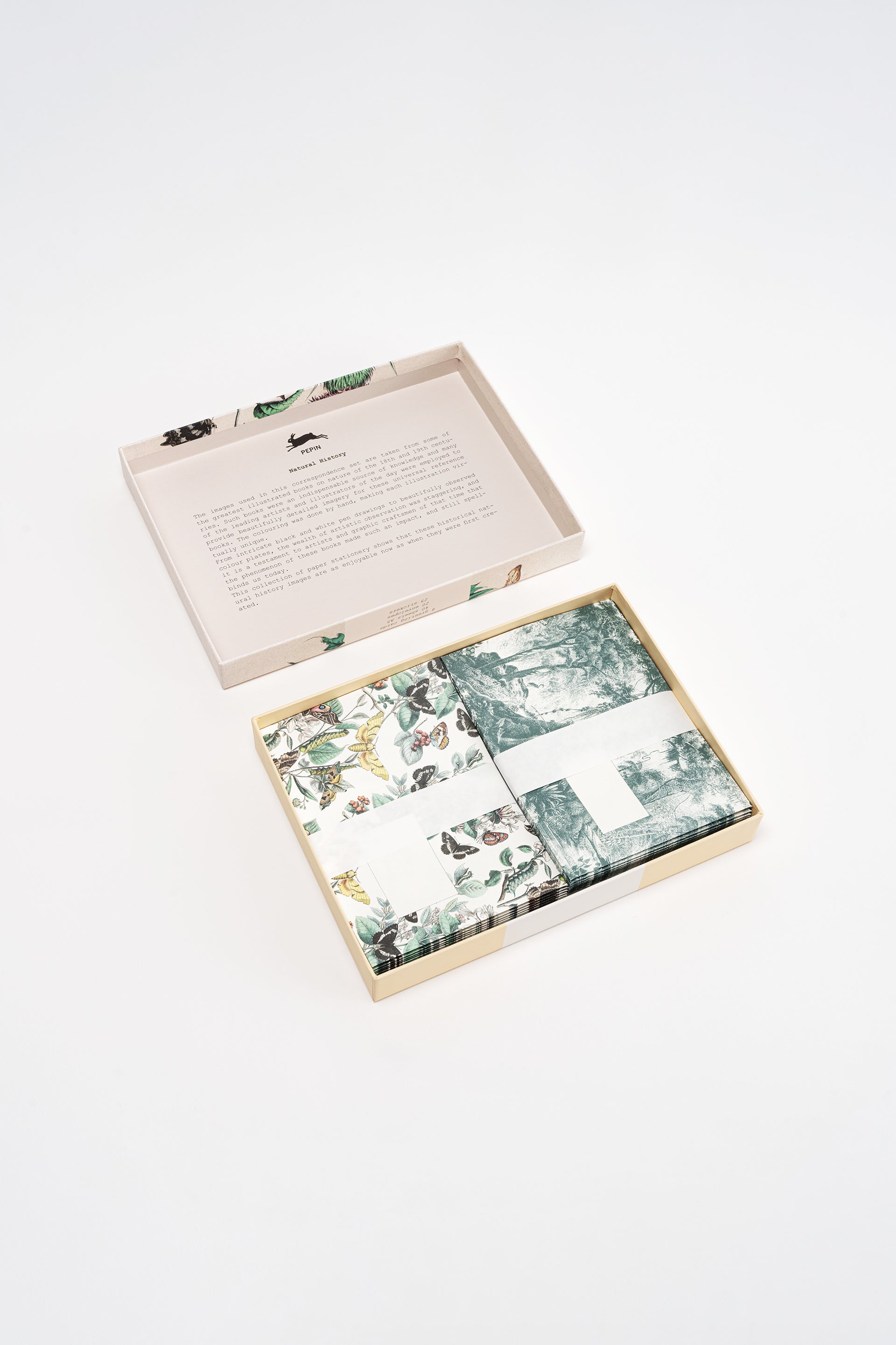 Each box contains 10 sheets of 4 different designs (printed on one side), making up 40 sheets of A5 writing paper (150 x 210mm / 6” x 8¼”). Included are 20 matching envelopes (10 x 2 designs), 8 greeting cards (2 x 4 designs) and 25 assorted stickers and labels.