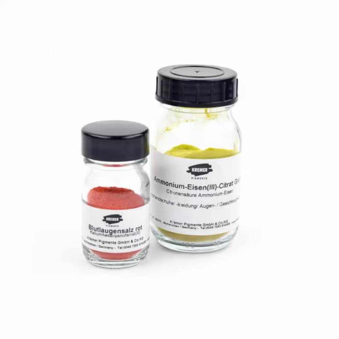 The set contains everything you need to create cyanotypes. The two chemicals Ammonium Iron(III) Citrate Green and Red Prussiate of Potash.