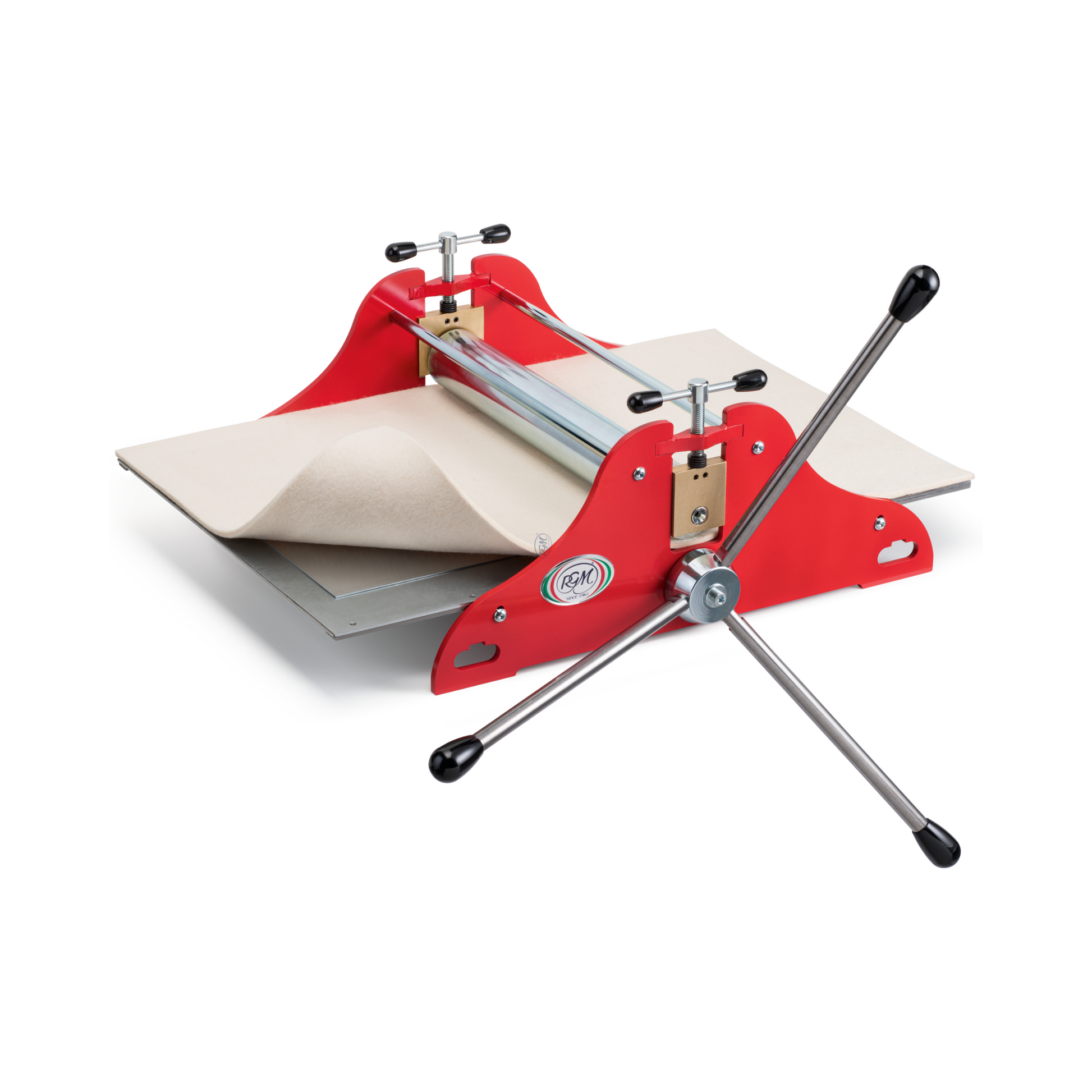 This robust etching press with a new red design can print on linoleum and on zinc, its size makes it possible to work on larger surfaces with the help of a 3-spoke handle.