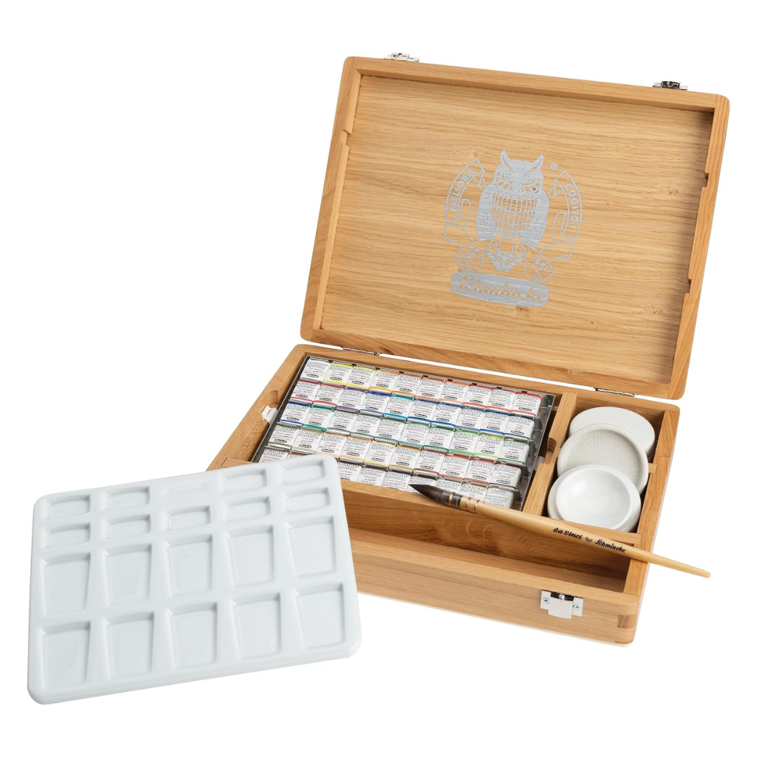 Elegant wooden set, solid light oak metal owl emblem with 50 of the finest artists' quality Horadam® watercolour half pans, a porcelain palette, da Vinci Brush #2 from the 418 series with real squirrel-hair and two porcelain bowls with lids for mixing larger quantities of paint or as a water container.