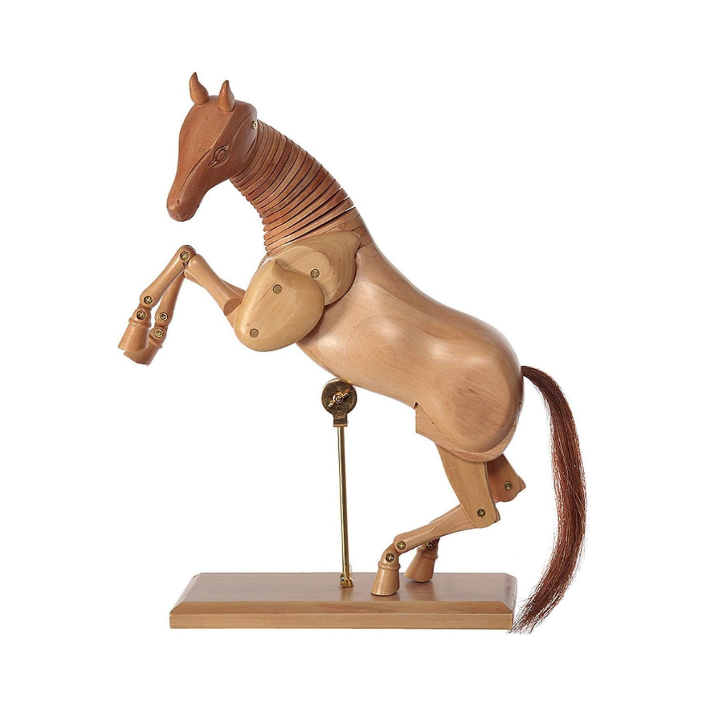 Þessi vandaði, liðaður tréhestur er frábært verkfæri fyrir listamenn, teiknara og alla hestaunnendur. Hann er handgerður úr slípuðum harðviði og búinn raunverulegum hestahárhala, sem gefur honum bæði náttúrulegt útlit og listrænt gildi.