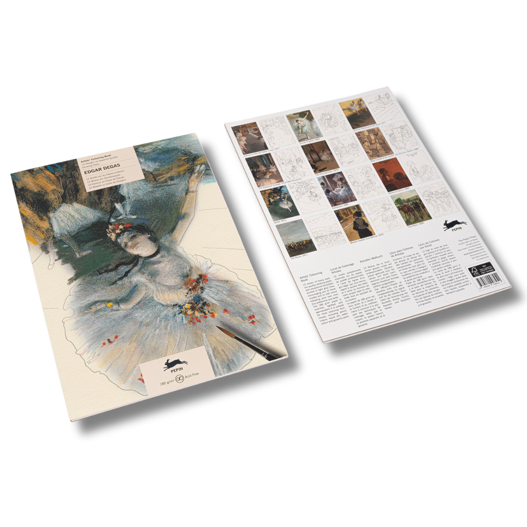 PEPIN Artists’ Colouring Books featuring Edgar Degas include 12 light-outlined designs printed on 180 gsm acid-free drawing paper. Recreate Degas’s graceful figures using pastels, gouache, or pencils, and let his iconic sense of movement inspire your work. The high-quality paper ensures lasting results, perfect for framing and celebrating Degas’s artistry.