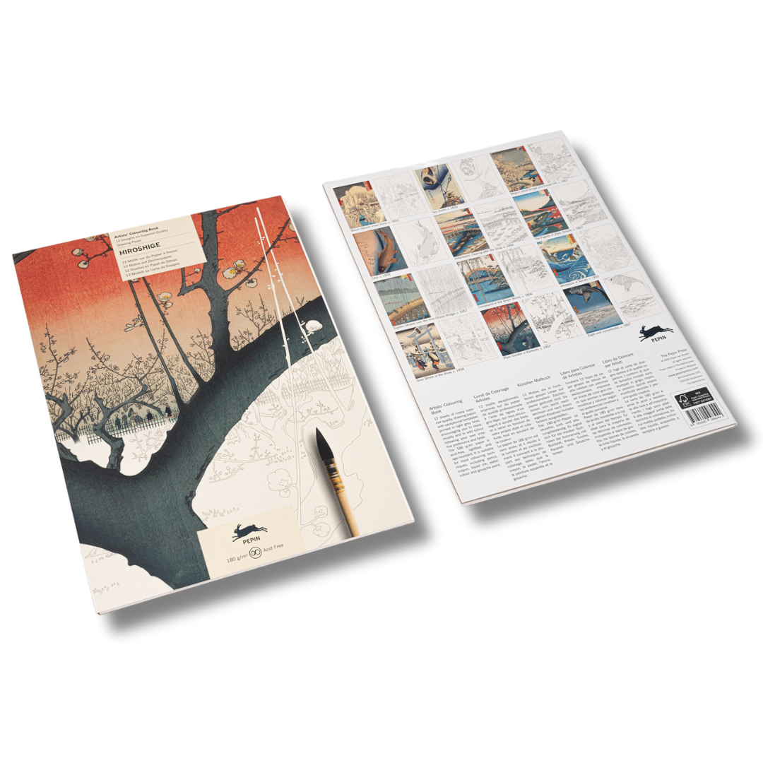 PEPIN Artists’ Colouring Books inspired by Hiroshige feature 12 light-outlined designs printed on 180 gsm acid-free drawing paper. Perfect for experimenting with watercolours, inks, or coloured pencils, the premium-quality paper brings out the subtlety and harmony of Hiroshige’s compositions. The finished pages make elegant pieces for framing and display.