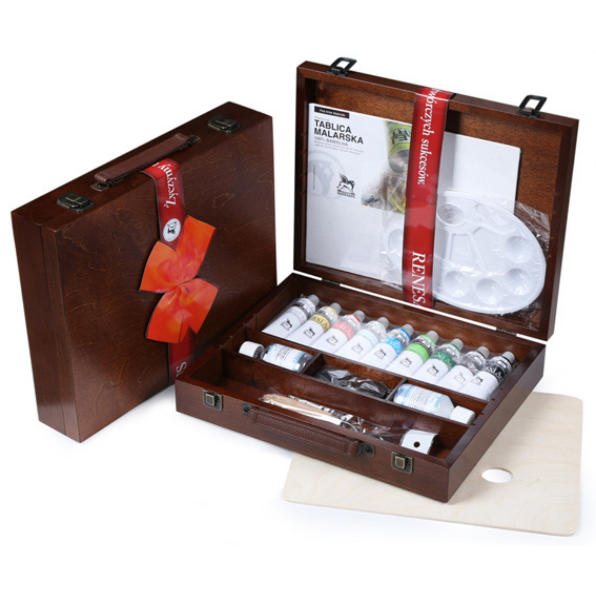 This Maxi Acril Set includes 9 tubes of the highest quality acrylic paints enclosed in a beautiful wooden case and accessories. It is the best choice when you seek highly pigmented water-based colours. Thanks to the packaging, this box can be an outstanding gift.