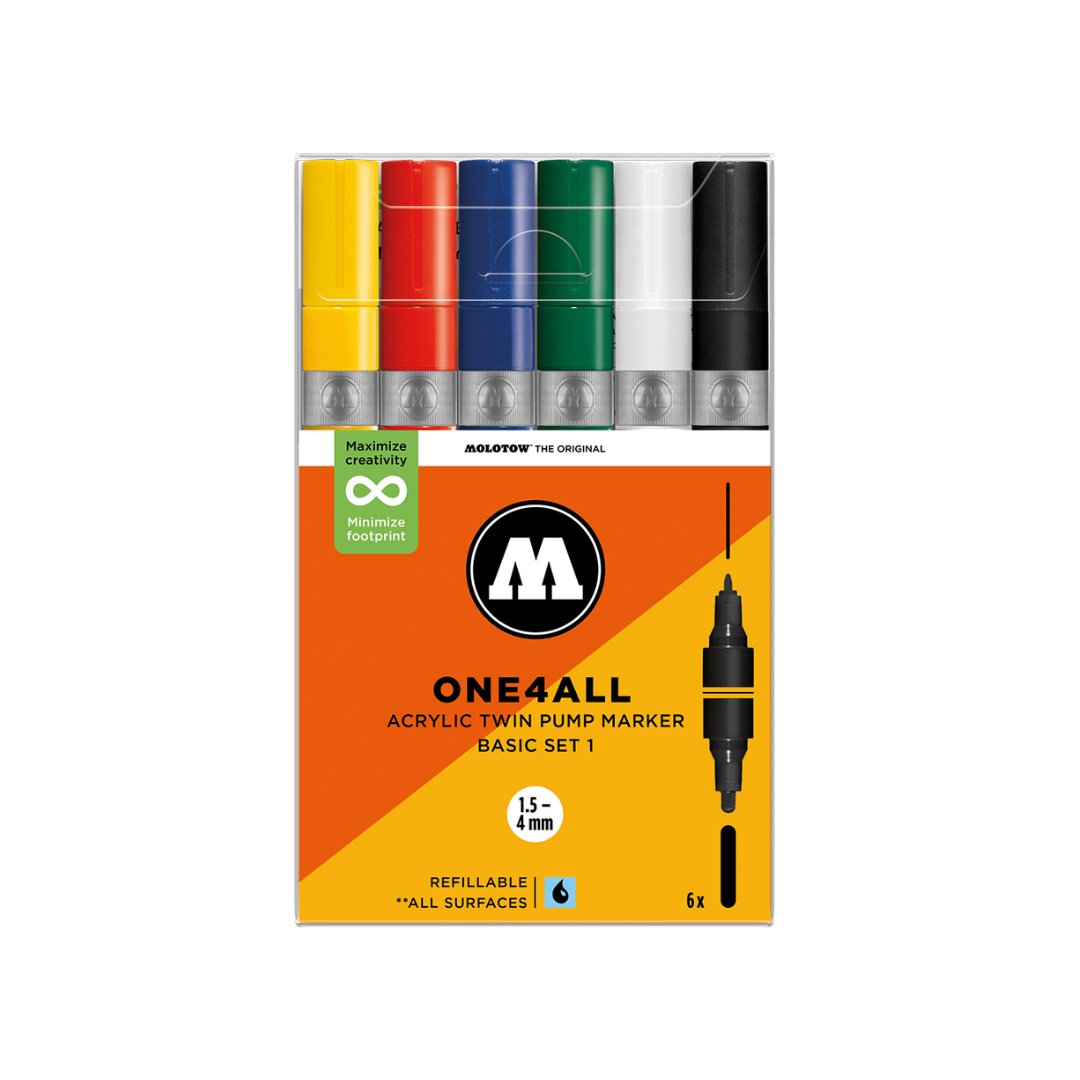 MOLOTOW ONE4ALL Twin Marker er fjölhæfasti akrýltússinn í MOLOTOW fjölskyldunni. Hann sameinar tvo odda í einum túss og gefur þér algjöra stjórn og sveigjanleika: