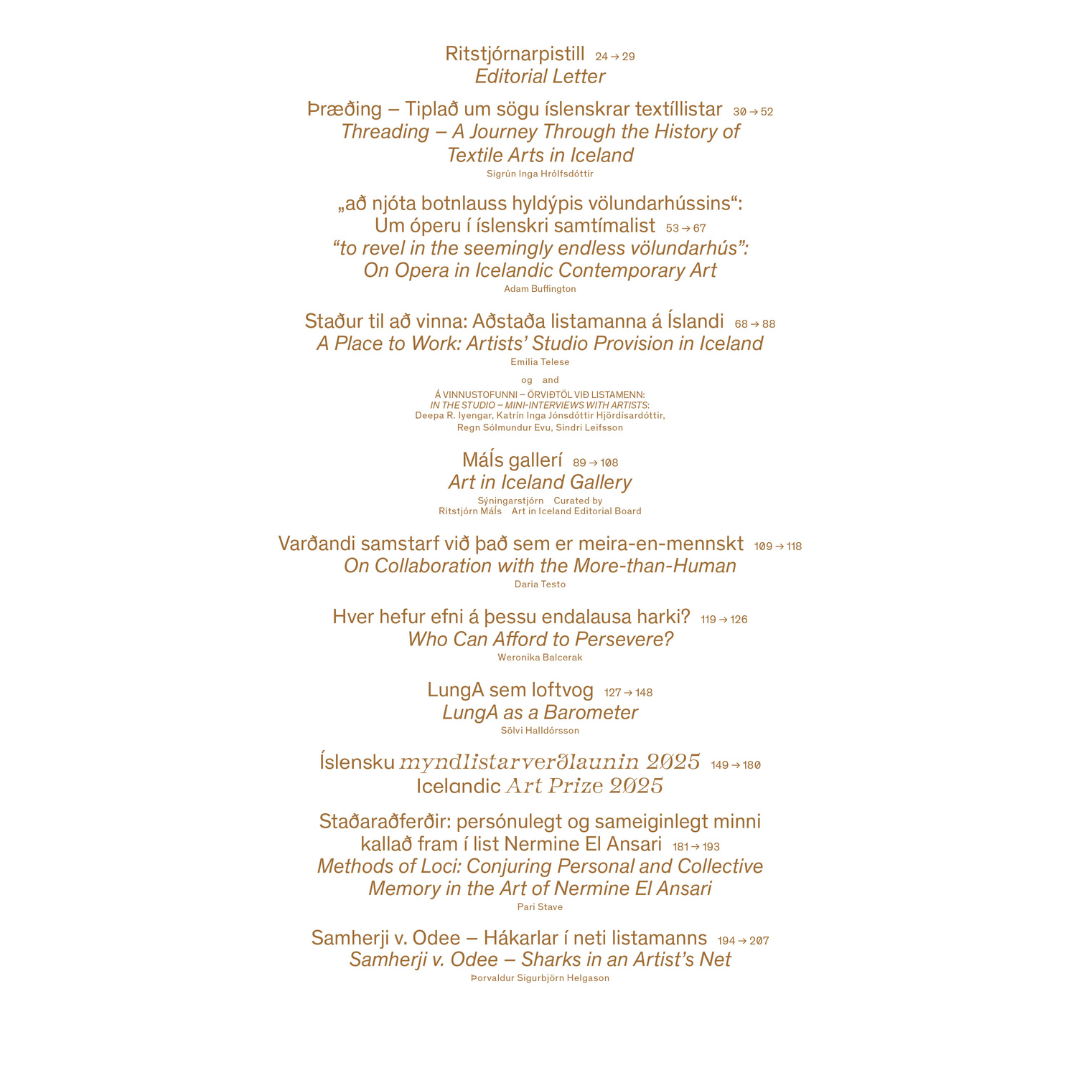 This issue delves into critical conversations on themes shaping the Icelandic art scene today. In addition to submissions, the magazine presents a carefully curated selection of visual content and special projects, serving as a vital platform for showcasing and discussing Icelandic visual art both locally and internationally. Contributors include artists, writers, curators, critics, scholars and other creative professionals.