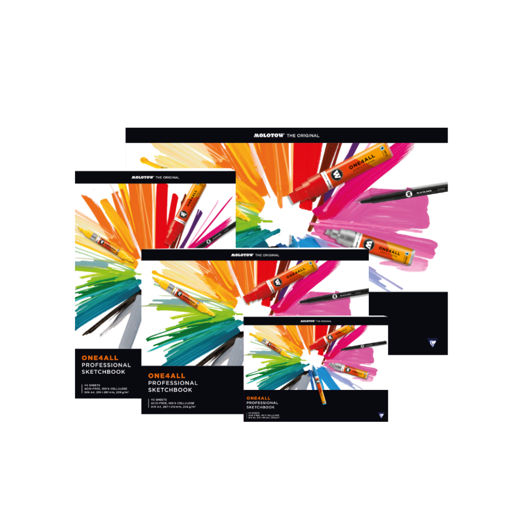 ONE4ALL faglegu teiknibækurnar innihalda hágæða akrýlpappír sem hefur verið sérstaklega þróaður til að virka fullkomlega með MOLOTOW ONE4ALL akrýltússunum.
