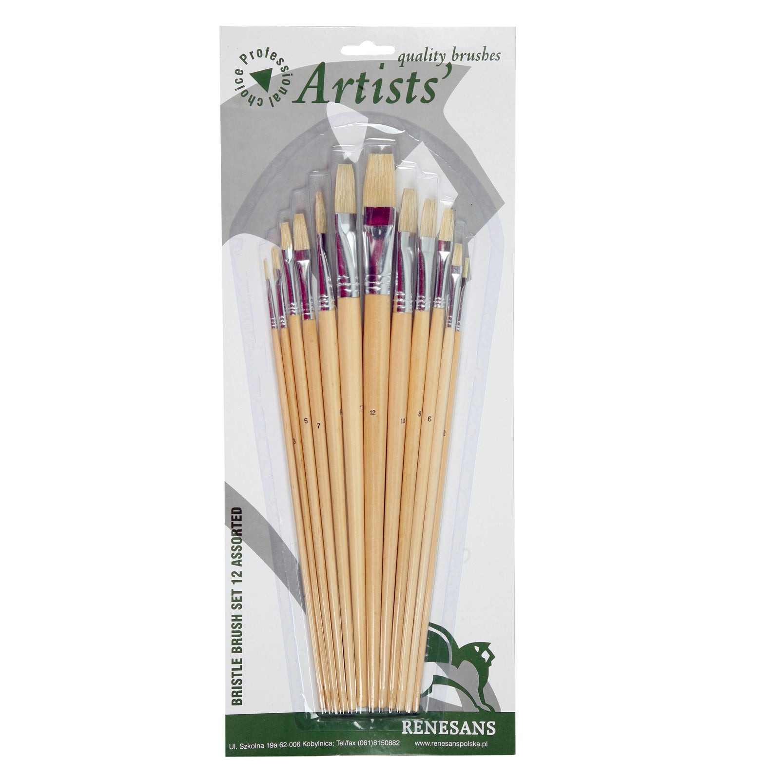 Set of 12 flat brushes, made with hogs hair. Perfect for anyone willing to pick up oil or acrylic painting.