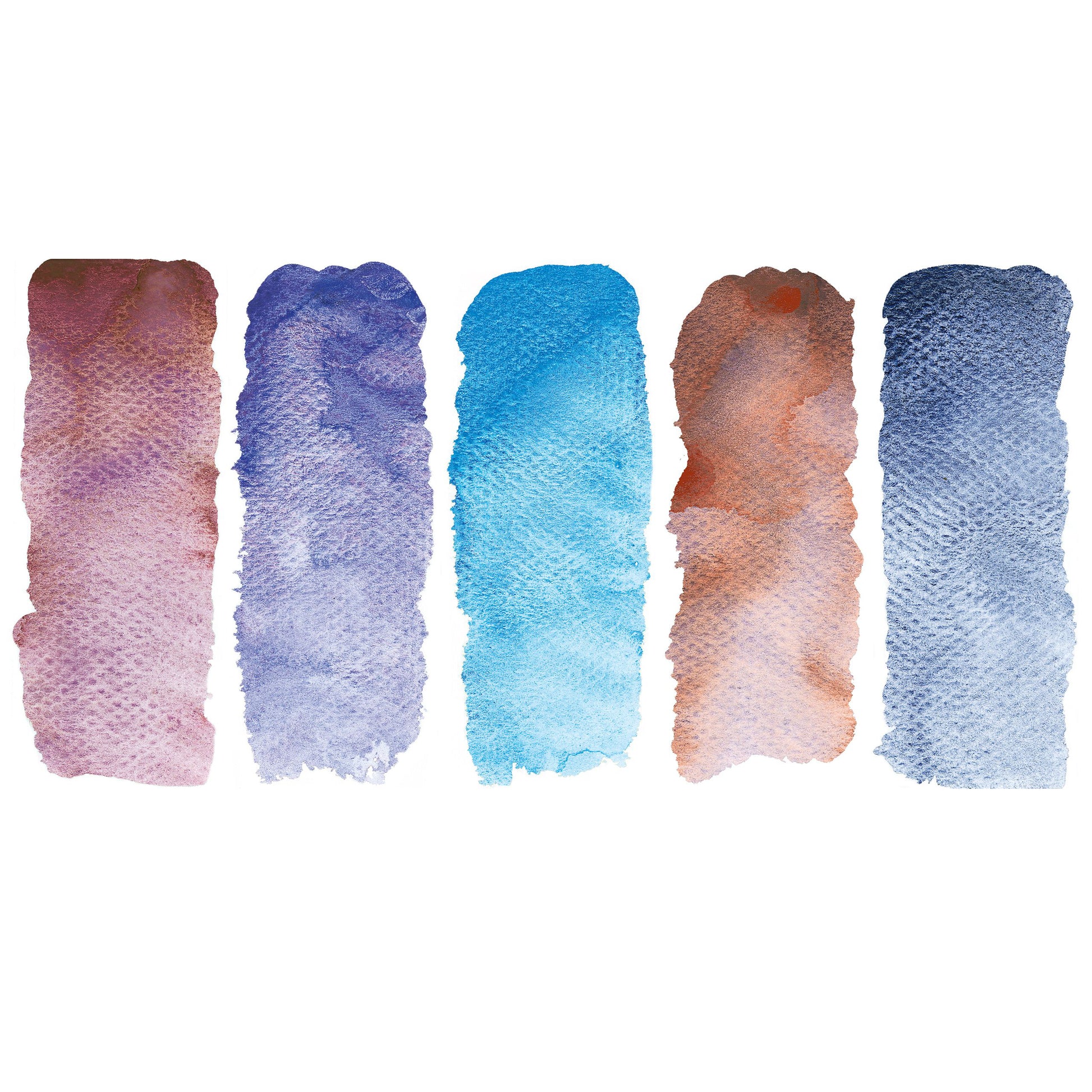 The new colours are formulated with pigments from different colour ranges, so that the granulation effect results in additional colour changings. For example, the colour “Deep Sea Indigo” (14952) is a combination of violet and green pigment, while “Glacier Brown” (14965) contains a brown and a green pigment. “Tundra Violet” (14 983) is a combination of brown and blue pigment, while “Forest Grey” (14 945) contains a black, a brown and a green pigment. This novel, natural structure formation of the colours varies depending on the substrate and the amount of water used. The rougher the paper, the stronger the granulation effect.