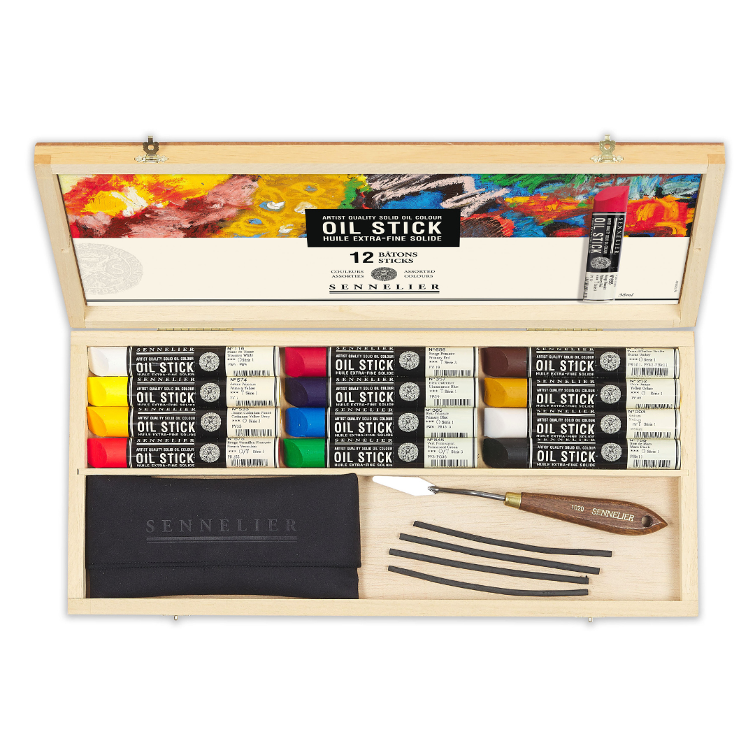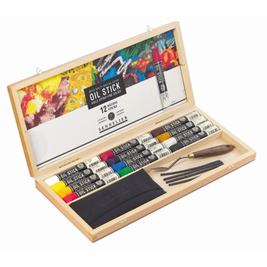 This set includes 12 x 38ml sticks, a palette knife, a box of charcoal sticks, and a cleaning cloth, all presented in an elegant wooden box.