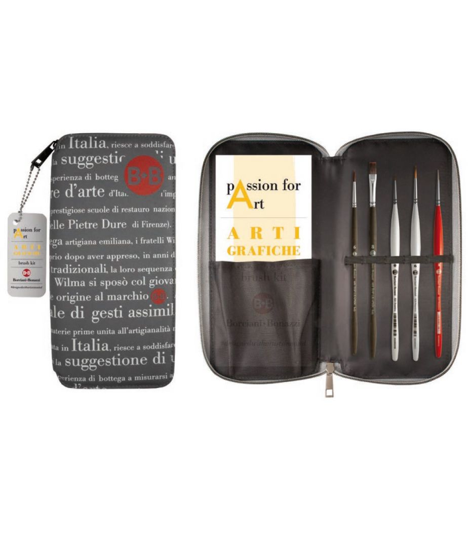 Inside there are a pockets and elastics. Contains a selection of five different synthetic brushes with medium absorbent fibers with a clean and precise brushstroke, ideal for the most up-to-date graphic techniques like Gouache.