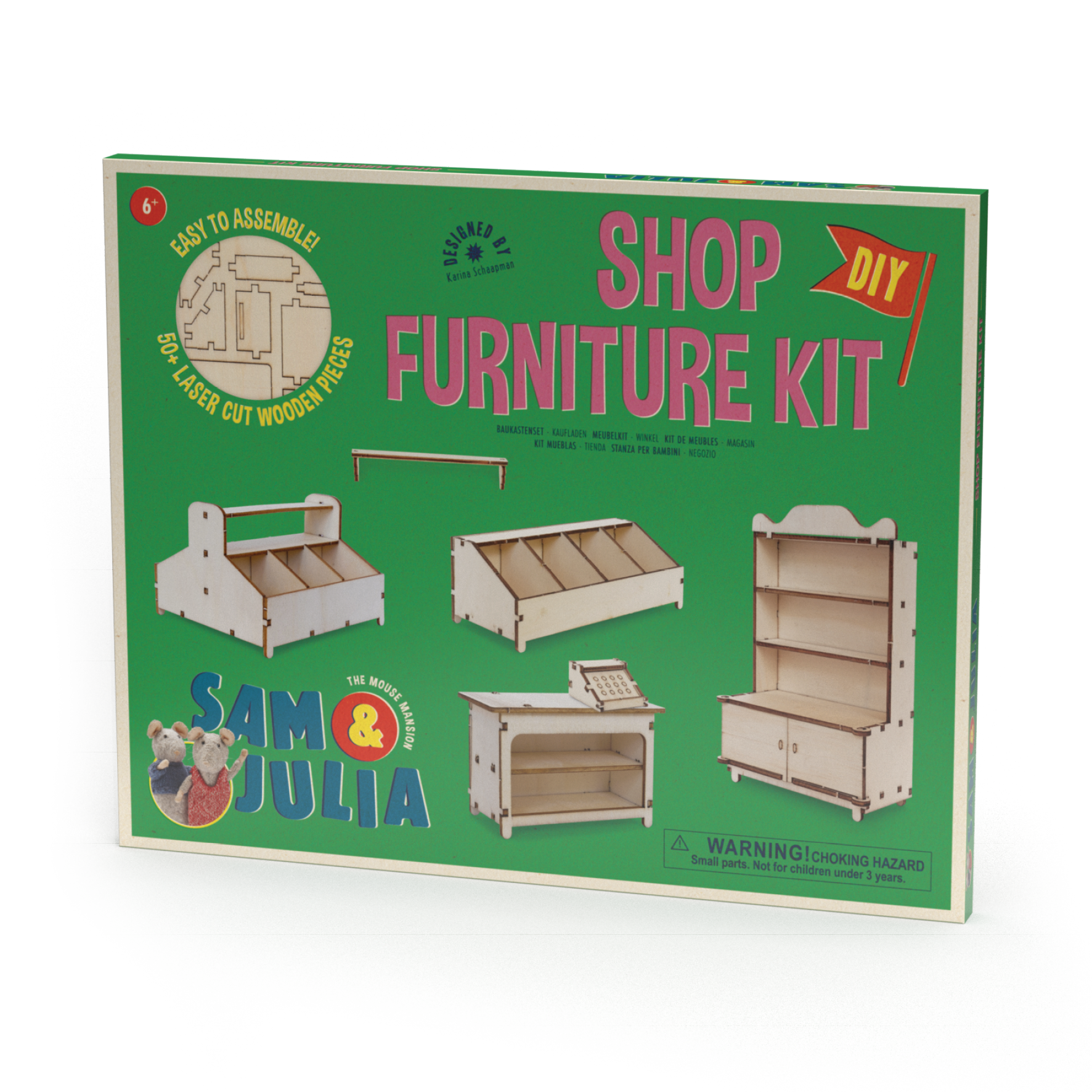 Búðu til litla búð með þessu skemmtilega húsgagnasetti! Viðarstykkin eru forútskorin og auðveld í samsetningu með einföldum leiðbeiningum. Settið er í mælikvarðanum 1:12 og byggir á heillandi heimi Húss músa eftir Karina Schaapman – fullkomið til að færa ævintýri Sam og Julia til lífsins.