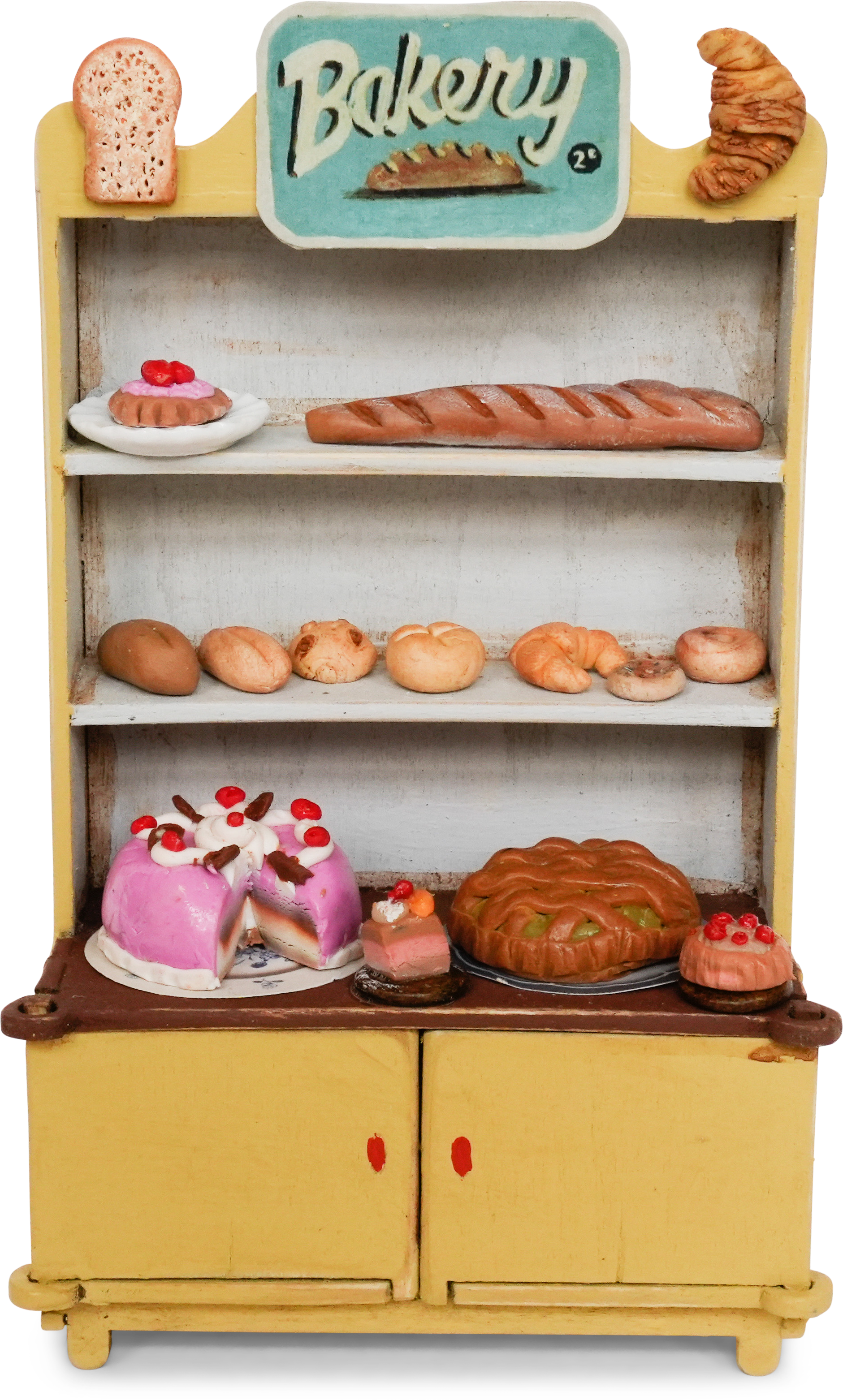 Í settinu er að finna litla geymsluskáp, afgreiðsluborð, tvöfaldan sýningarskáp og stakan sýningarskáp.