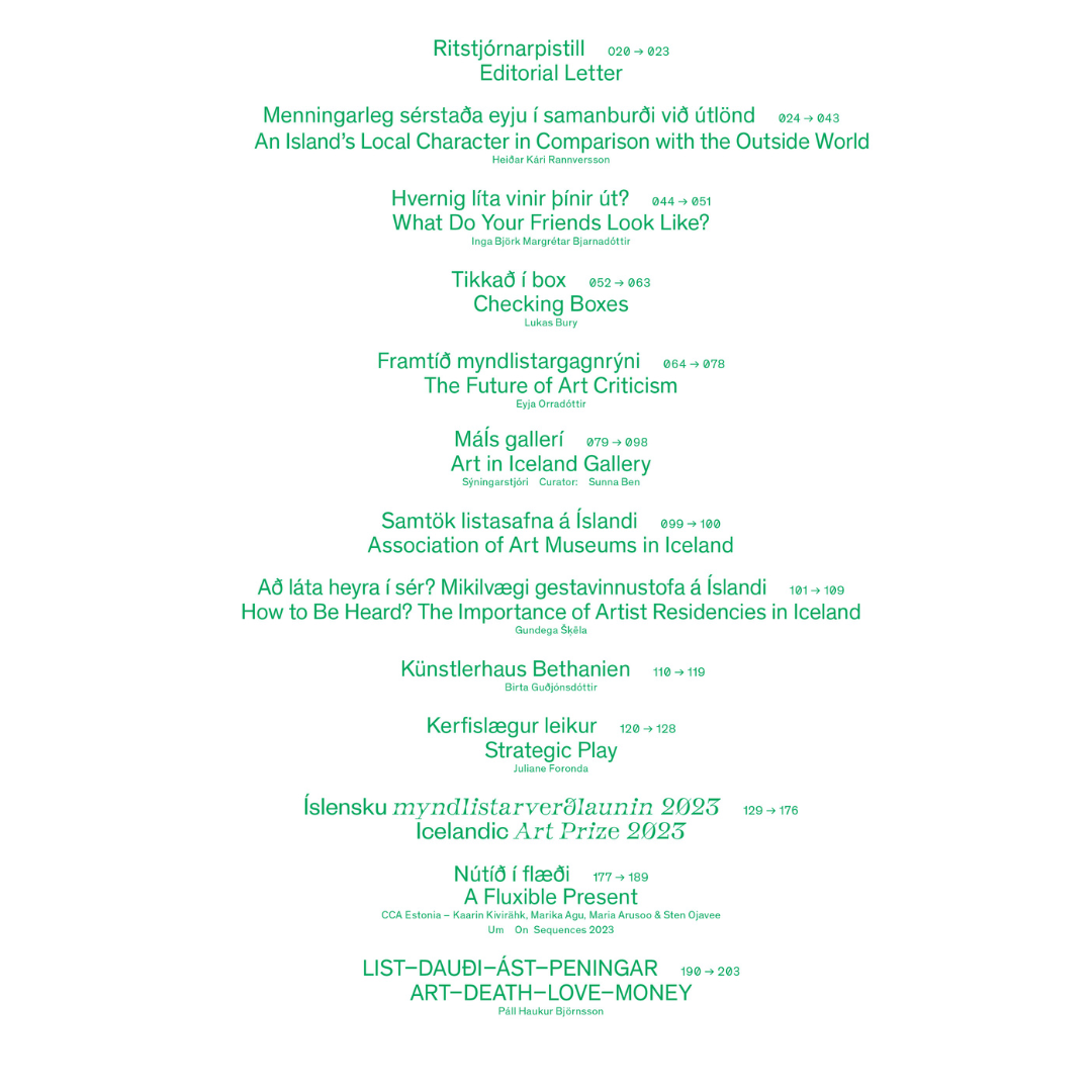This issue explores critical conversations on themes shaping the Icelandic art scene today. In addition to submissions, the magazine presents a carefully curated selection of visual content and special projects, serving as a vital platform for showcasing and discussing Icelandic visual art both locally and internationally. Contributors include artists, writers, curators, critics, scholars and other creative professionals.