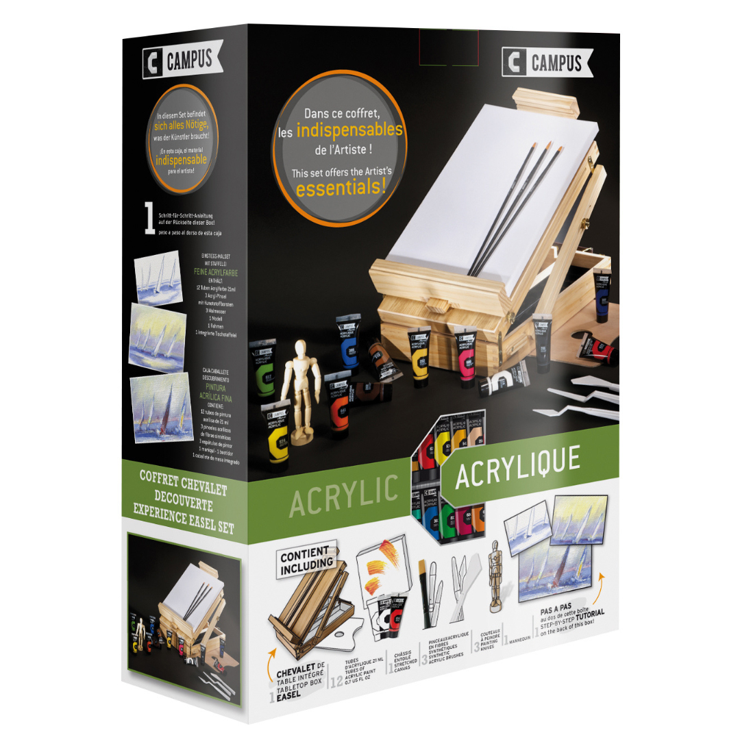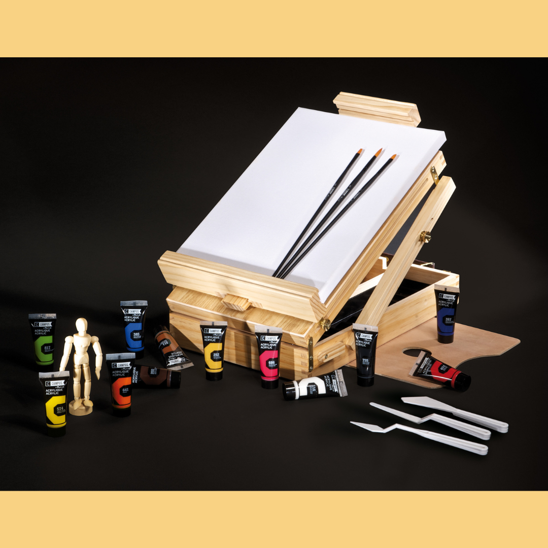 The Discovery Easel Set provides everything an aspiring artist needs to begin painting with confidence. This comprehensive collection includes 12 tubes of vibrant acrylic paint (21ml each), a pre-stretched canvas ready for immediate use, three synthetic brushes for varied application techniques, three painting knives for texture and detail work, and an articulated wooden mannequin for figure reference studies. The included easel offers stable support for canvas work, while the thoughtfully curated tools allow exploration of multiple painting methods. Ideal for beginners transitioning from sketching to colour work, or experienced artists seeking a portable, all-in-one painting solution.