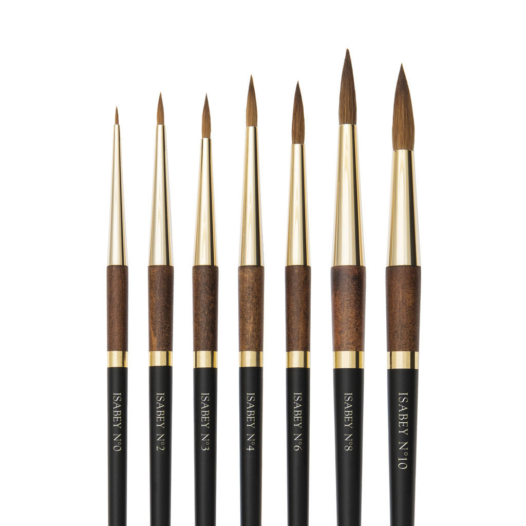 Extremely fine and soft, the Kolinsky Sable respond to the lightest touch, spreading out into a fan, creating a wide line and returning to their original position whilst retaining a perfect tip. With the Isabey Grey Squirrel, an extremely effective water retaining brush, the subject of a work can be executed with ease. Sable brushes absorb more colour, less water and provide more relief and intensity with their responsiveness.