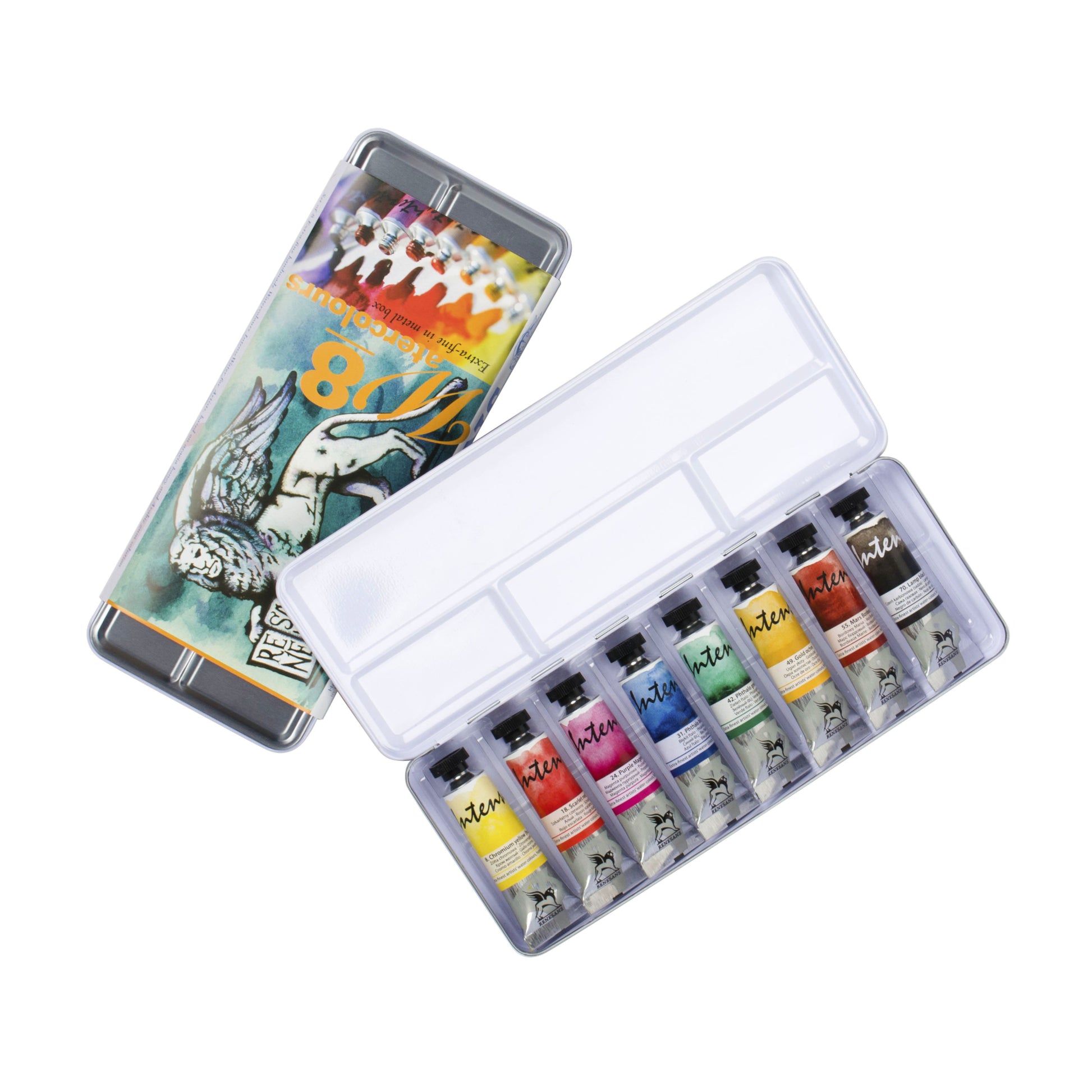 Colours included: 08. Chromium yellow (hue), 18. Scarlet red, 24. Purple Magenta, 31. Phthalo blue, 42. Phthalo green, 49. Gold ochre, 55. Mars Bordeaux, 70. Lamp black.